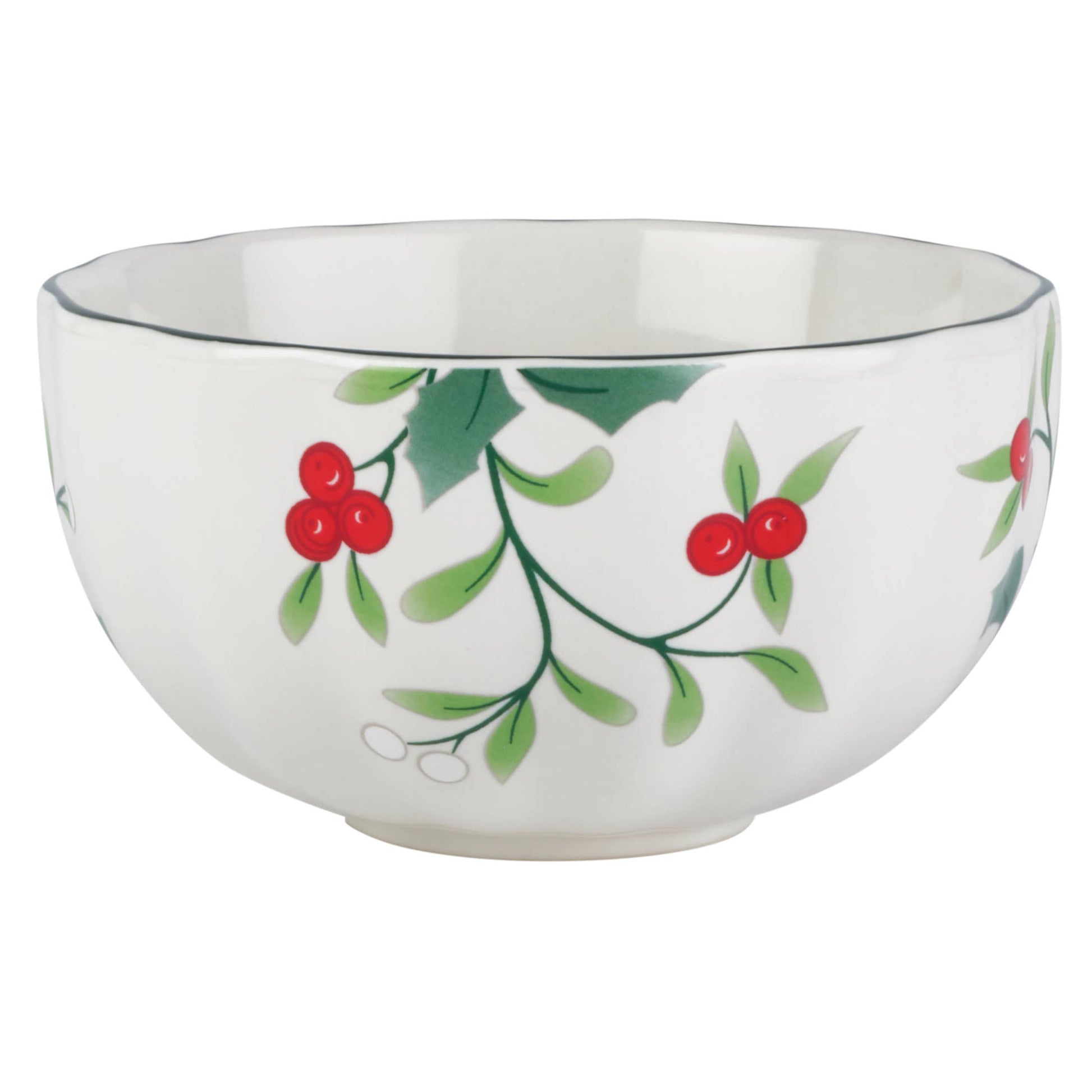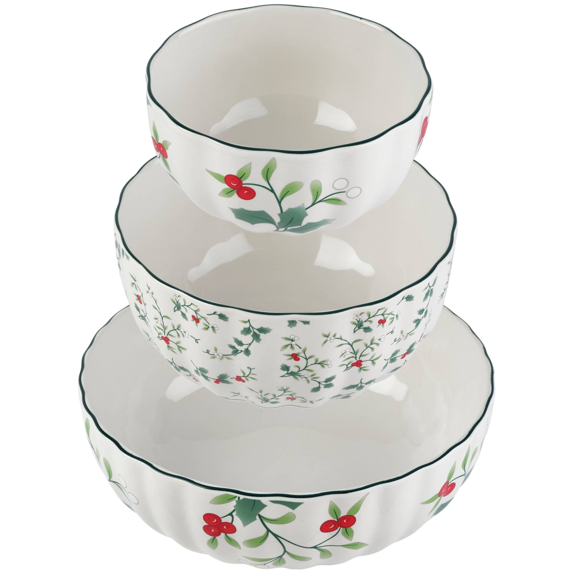 As fall turns to winter bright holly berries make their appearance; Winterberry dinnerware is the holiday classic that brings this timeless motif to life in elegantly sculpted dinnerware and serveware beautiful glassware and joyous giftware. With its timeless look, this set of 3 scalloped bowls adorned with the festive red and green Winterberry pattern will be a part of your holiday traditions for years to come. Beautifully crafted of dolomite for strength and durability, this set features all the bowls you need to serve snacks, sides, nuts, and candy or to enjoy individual servings of pudding, ice cream, custard, and throughout the holidays. Set of 3 bowls includes one 3-3/4 inch high by 9 inch diameter serving bowl, one 3-1/4 high by 6 inch diameter all-purpose bowl, and one 2-1/3 inch high by 4-1/2 inch diameter fruit bowl. Microwave and dishwasher safe.